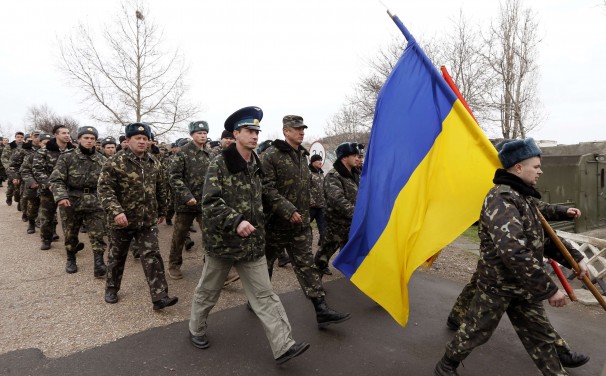Ukrainian servicemen march away from the Belbek airport Tuesday. (Vasily Fedosenko/Reuters)