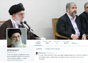 The Twitter page of Iranian Supreme Leader Ayatollah Khamenei, photographed sitting next to Hamas leader Khaled Meshaal. Photo: Screenshot / Twitter.