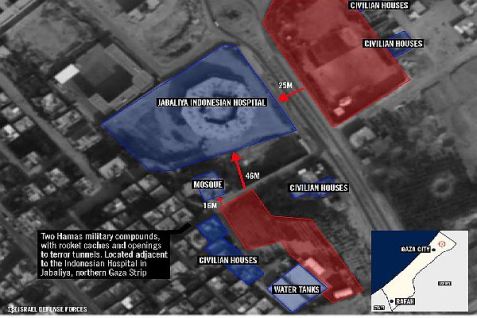 Map of Hamas terror bases and tunnel adjacent to hospital in Jabaliya in northern Gaza. July 22, 2014. Photo Credit: IDF Spokesperson’s Unit