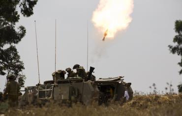 An Israeli soldier sits atop a mobile artillery unit in a staging area outside the Gaza Strip Photo: REUTERS