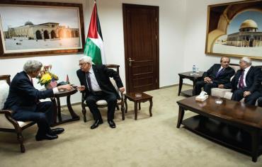 US SECRETARY of State John Kerry and Palestinian Authority President Mahmoud Abbas talk while PLO Executive Committee member Yasser Abed Rabbo and Palestinian negotiator Saeb Erekat talk on the side during a meeting at the presidential compound in Ramallah. Photo: REUTERS