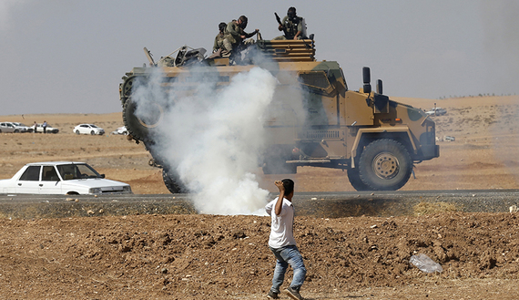 A protester throws stones at a Turkish armored vehicle during a pro-Kurdish demonstration in solidarity with the people of Kobani, near the Mursitpinar border crossing on the Turkish-Syrian border, Oct. 7, 2014. (photo by REUTERS/Umit Bektas)