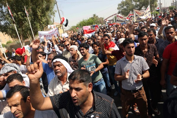 Residents chant slogans supporting the creation of Basra region, in front of the Basra provincial headquarters, Basra, Iraq, Sept. 27, 2014 (AP photo by Nabil al-Jurani)
