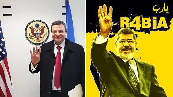 While being hosted by the State Department on a visit to Washington, Muslim Brotherhood judge Waleed Sharaby (left) flashed the organization’s four-finger “Rabia” sign. At right, ousted Egyptian President Mohamed Morsi (from the Muslim Brotherhood) displays the Rabia sign.