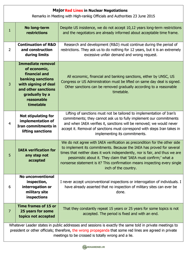 With less than a week to go before the nuclear negotiation’s June 30 deadline, Iran can’t seem to take yes for an answer. Despite tireless (some are saying desperate and counterproductive) efforts by Secretary of State John Kerry to make a deal happen, Iran’s Supreme Leader appears to be doing his utmost to cause a breakdown. Ayatollah Khamenei took to Twitter to state seven Iranian red lines:
