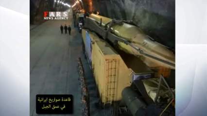 The video, aired on semi-official Fars TV and set to rousing music, shows an extensive tunnel packed with medium- and long-range missiles and launcher units.