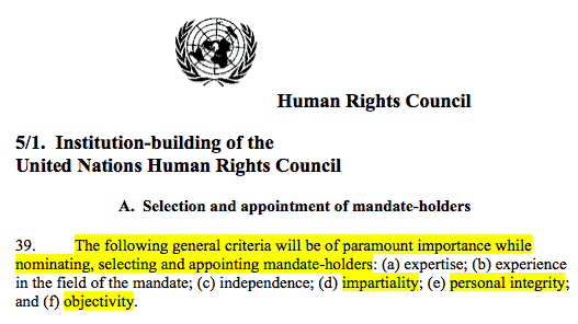 Under the rules of the Council, as defined in resolution 5/1 and 16/21, the criteria of “impartiality” and “objectivity” are to be of “paramount importance” when selecting and appointing mandate-holders.