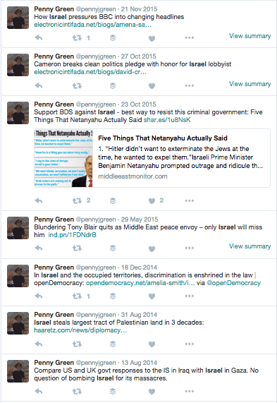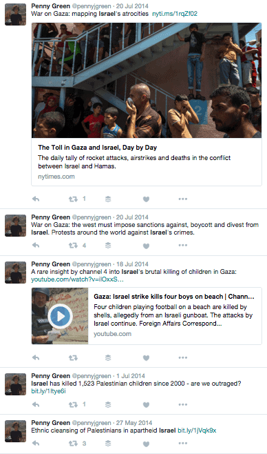 Green, who was ranked first by the UNHRC’s vetting committee, also advocates the total boycott of Israel, posting statements on Twitter such as: “Support BDS against Israel—best way to resist this criminal government”; “Academics should now systematically refuse any invitations to visit Israeli universities or attend conferences there”; “the West must impose sanctions against, boycott and divest from Israel.”
