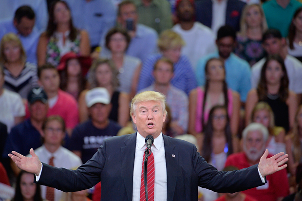 WILMINGTON, NC – AUGUST 9: Republican presidential candidate Donald Trump addresses the audience during a campaign event at Trask Coliseum on August 9, 2016 in Wilmington, North Carolina. This was TrumpÕs first visit to Southeastern North Carolina since he entered the presidential race. (Photo by Sara D. Davis/Getty Images)