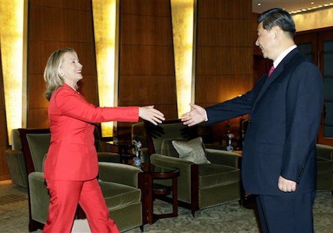 U.S. Secretary of State Hillary Clinton, left, prepares to shake hands with China’s Vice President Xi Jinping during a meeting at Diaoyutai State Guesthouse in Beijing, Thursday, May 3, 2012. (AP Photo/Jason Lee, Pool)