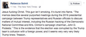 Meanwhile, liberal commentator Rebecca Solnit declared this to be a “smoking gun” that proves Trump’s “treason,” while Daily Kos’ Markos Moulitsas sounded the same theme: