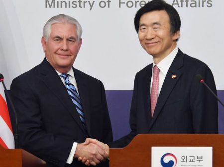 SEOUL, SOUTH KOREA – MARCH 17: (L to R) U.S. Secretary of State Rex Tillerson shakes hands with South Korean Foreign Minister Yun Byung-se during a press conference on March 17, 2017 in Seoul, South Korea. U.S. Secretary of State Rex Tillerson will meet with the acting President Hwang Kyo-ahn and Foreign Minister Yun Byung-se during his two-day stay. (Photo by Song Kyung-Seok-Pool/Getty Images)