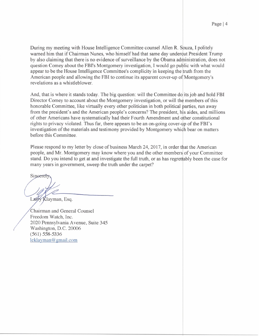 Letter from Freedom Watch to House Intelligence Committee re possible cover-up of illegal NSA/CIA surveillance of Trump and others » freedomwatch4