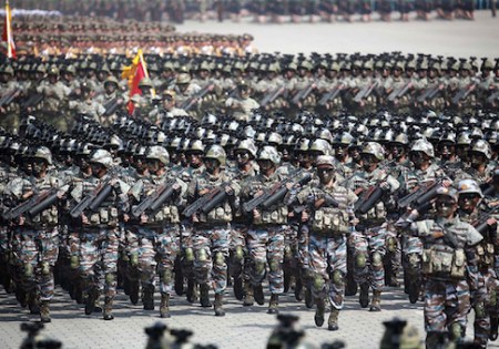 This April 15, 2017 picture released from North Korea’s official Korean Central News Agency (KCNA) on April 16, 2017 shows Korean People’s Army (KPA) soldiers marching through Kim Il-Sung square during a military parade in Pyongyang marking the 105th anniversary of the birth of late North Korean leader Kim Il-Sung. / AFP PHOTO / KCNA VIA KNS / STR / South Korea OUT / REPUBLIC OF KOREA OUT —EDITORS NOTE— RESTRICTED TO EDITORIAL USE – MANDATORY CREDIT “AFP PHOTO/KCNA VIA KNS” – NO MARKETING NO ADVERTISING CAMPAIGNS – DISTRIBUTED AS A SERVICE TO CLIENTS