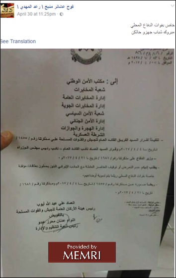 As noted, on May 2, 2017, the Facebook page of the Manjab Tribe Brigade, Ra’d Al-Mahdi published a photo of the memo, which is which is marked “No. 1455” and addressed to “the Honorable Commander in Chief of the Army and Armed Forces and President of Syria.” It states: “With Allah’s help, we will not disappoint you, heroes of Ra’d Al-Mahdi. We have promised and we have kept [our promise].”[3]