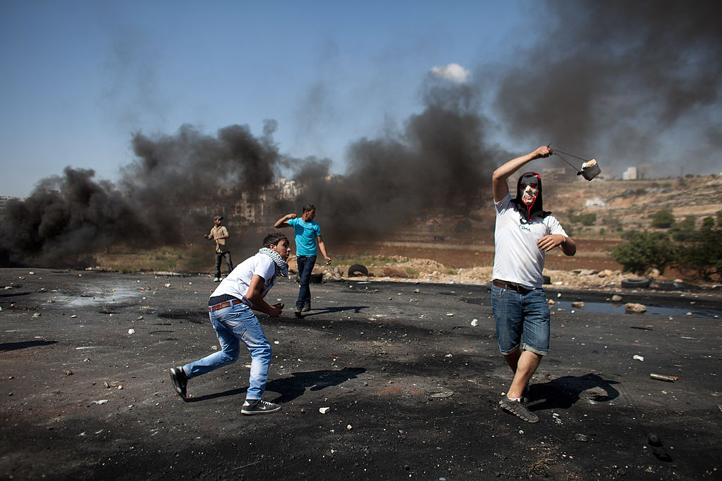 RAMALLAH, WEST BANK – MAY 15: (ISRAEL OUT) Palestinian demonstrators throw stones toward Israeli soldiers during clashes outside of Ofer Prison on May 15, 2012 near the West Bank city of Ramallah. Palestinians mark Israel’s establishment in 1948 with “Nakba” or “catastrophe” day on May 15, to remember the thousands of Palestinians who fled or were expelled during the creation of the Jewish state and the subsequent war. (Photo by Uriel Sinai/Getty Images)