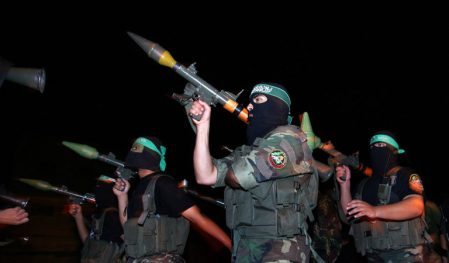 RAFAH, GAZA STRIP – JULY 27: Masked Palestinian fighters of the Ezz El-Den Al-Qassam brigades, the military wing of the Islamic Resistance Movement ‘Hamas’ carry their weapons as they participate in a show of power march along a street early on July 27, 2008 in the refugee camp of Rafah, Gaza Strip. Israeli troops killed a top Hamas militant on Sunday in the West Bank town of Hebron despite a cease-fire agreement in the Hamas-ruled Gaza Strip. (Photo by Abid Katib/Getty Images)