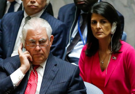 NEW YORK, NY – APRIL 28: US Secretary of State Rex Tillerson (L) and US Ambassador to the UN Nikki Haley (R) listen as China’s Foreign Minister Wang Yi speaks during a security council meeting on nonproliferation of North Korea at United Nations on April 28, 2017 in New York City. The growing threat of nuclear North Korea is going to be the focus for Secretary of State Rex Tillerson while he chairs a special meeting of the United Nations Security Council.. (Photo by Eduardo Munoz Alvarez/Getty Images)