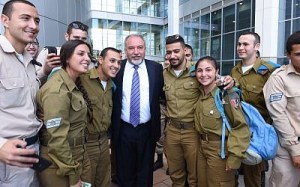 Defense Minister Avigdor Liberman, center, poses with IDF soldiers during an event at the Defense Ministry in Tel Aviv, October 10, 2017. (Defense Ministry)