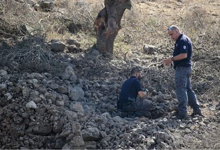 ![]() Police sappers inspecting the location where a rocket hit the Golan Heights over the weekend |