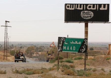 A vehicle drives past a billboard bearing the logo of the Islamic State (IS) group in Madan area, in the countryside of Deir Ezzor, on September 24, 2017, as Syrian government forces continue to press forward with Russian air cover in the offensive against the jihadists across the province. / AFP PHOTO / STRINGER (Photo credit should read STRINGER/AFP/Getty Images)