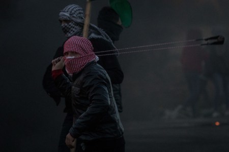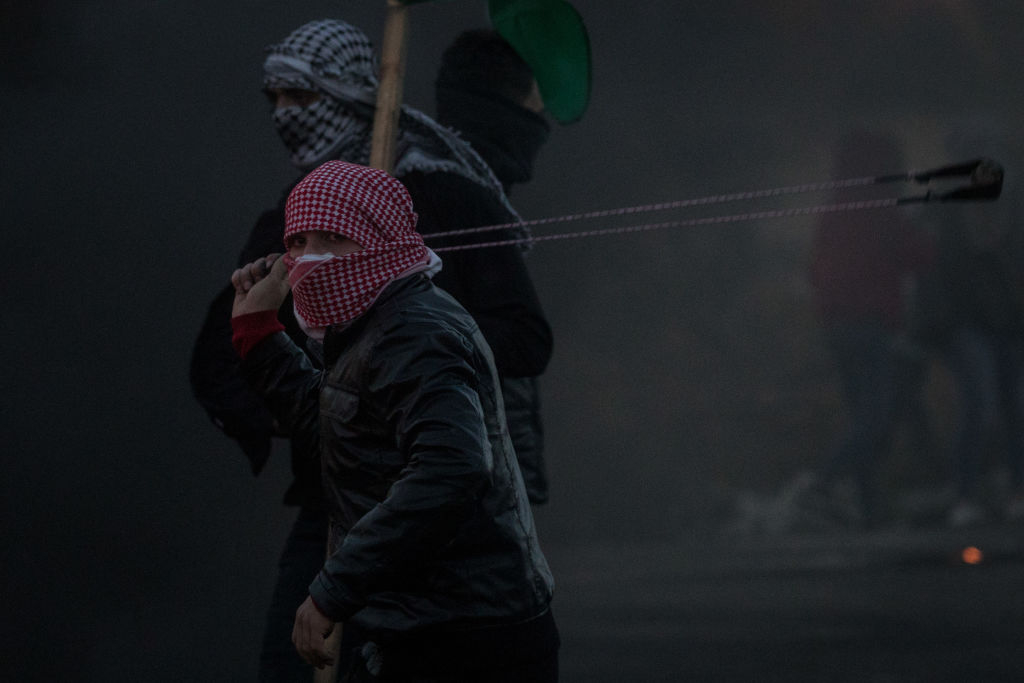 RAMALLAH, WEST BANK – DECEMBER 09: A Palestinian protester hurls stones at Israeli border guards during clashes near an Israeli checkpoint on December 9, 2017 in Ramallah, West Bank. Protests and clashes continued into a fourth day across Jerusalem and the West Bank following U.S. President Donald Trump’s decision to recognize Jerusalem as Israel’s capital. (Photo by Chris McGrath/Getty Images)