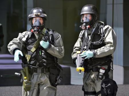 South Korean military biochemical warfare soldiers take part in an anti-terror drill in Seoul on May 3, 2011. A North Korean defector was found to have anthrax antibodies in his blood, an intelligence source told South Korean media. JUNG YEON-JE/AFP/GETTY IMAGES