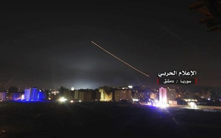 Illustrative. A photo provided by the pro-regime Syrian Central Military Media, shows anti-aircraft fire rise into the sky as Israeli missiles hit air defense positions and other military bases around Damascus, Syria, on May 10, 2018, after the Israeli military says Iranian forces launched a rocket barrage against Israeli bases on the Golan Heights, in the most serious military confrontation between the two bitter enemies to date. (Syrian Central Military Media, via AP)