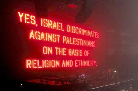 During the intermission, instructions shot from the screen. The word “resist” appeared a number of times. At first, the audience, who had only come to see a rock show, was told to resist anti-Semitism in general. Then we were told to resist Israeli anti-Semitism.