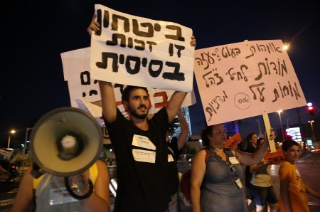 Protested waved signs reading, “Security is a basic right,” “I have no other country,” “We’re not cannon fodder,” and “No truce when the south is on fire.”