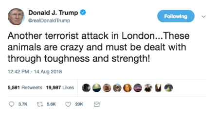 The President tweeted: “Another terrorist attack in London…These animals are crazy and must be dealt with through toughness and strength!”