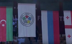 The International Judo Federation flag flies for Israeli gold medalist Tal Flicker because Israel’s national symbols were banned at the 2017 Abu Dhabi Grand Slam. (Screen capture: YouTube)