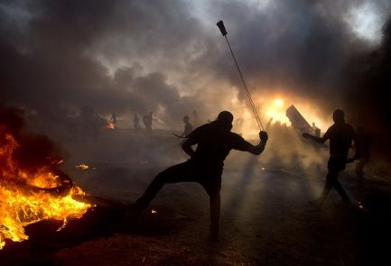Palestinian protesters hurl stones at Israeli troops during a riot on the Gaza border