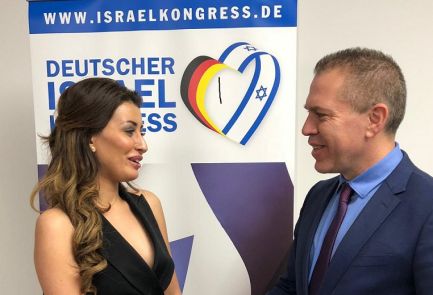Strategic Affairs Minister Gilad Erdan speaks with Iraqi beauty queen Sarah Idan in Frankfurt, Sunday