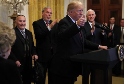 Hosting a White House Hanukkah event, U.S. president elicits cheers after pledging to prevent Iran from getting nuclear weapons • Father of Parkland shooting victim calls Trump “the greatest friend the Jewish people ever had in the White House.”