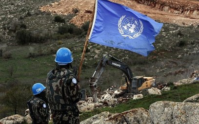 In this Thursday, December 13, 2018, photo, UN peacekeepers hold their flag, as they observe Israeli excavators working near the southern border village of Mays al-Jabal, Lebanon. (AP/Hussein Malla)