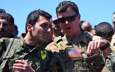 A file photo taken on April 25, 2017, shows a US military officer (R) speaking with a fighter from the Kurdish People’s Protection Units (YPG) at the site of Turkish airstrikes near the northeastern Syrian Kurdish town of Derik, known as al-Malikiyah in Arabic. (Delil Souleiman/AFP)