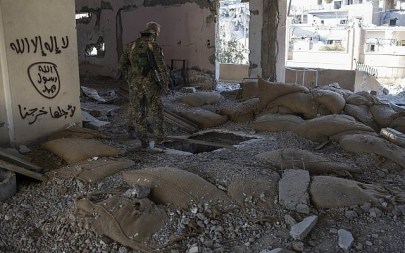 Members of the US-backed Syrian Democratic Forces (SDF) check for bombs at the stadium that was the site of Islamic State fighters’ last stand in the city of Raqqa, Syria, Wednesday, October 18, 2017. (AP/Asmaa Waguih)