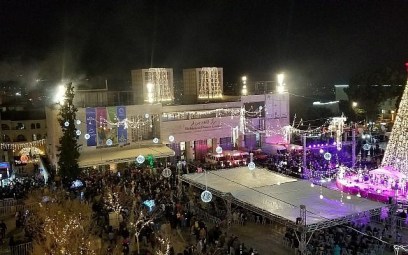 A tall and brightly lit Christmas tree stood in the middle of Manger Square, the plaza adjacent to the church claimed to be built on the site where Jesus was born, and groups of Palestinian locals sang holiday carols and other songs atop a stage adorned with glowing baubles.
