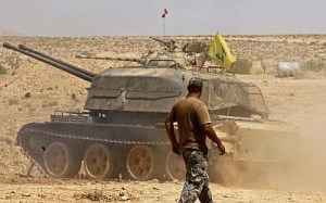 Illustrative image of a tank flying the Hezbollah terror group’s flag seen in the Qara area in Syria’s Qalamoun region on August 28, 2017 (AFP Photo/Louai Beshara)