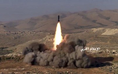 This frame grab from video released on July 22, 2017, and provided by the government-controlled Syrian Central Military Media, shows Hezbollah fighters firing a missile at positions of al-Qaeda-linked militants in an area on the Lebanon-Syria border. (Syrian Central Military Media, via AP)