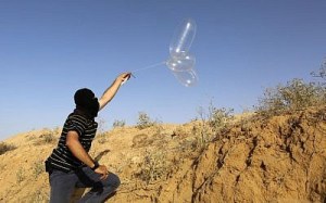 Illustrative: A masked Palestinian man launches a balloon loaded with flammable materials toward Israel from the southern Gaza town of Rafah on June 17, 2018. (AFP Photo/Said Khatib)