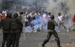 Opposition demonstrators clash with security forces during a protest against the government of President Nicolas Maduro on the anniversary of the 1958 uprising that overthrew the military dictatorship, in Caracas, Venezuela, on January 23, 2019. (Yuri Cortez/AFP)
