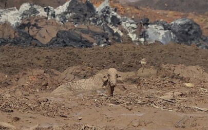 A cow sits stuck after a dam collapsed in Brumadinho, Brazil, Sunday, Jan. 27, 2019. Brazilian officials on Sunday suspended the search for potential survivors of a Jan. 25 dam collapse that has killed at least 40 people amid fears that another nearby dam owned by the same company was also at risk of breaching. (AP Photo/Andre Penner)