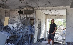 A man stands inside a house that was hit by a rocket fired from the Gaza Strip in the southern Israeli city of Ashkelon, on November 13, 2018 (Nati Shohat/Flash90)
