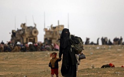 Civilians fleeing the Islamic State’s group embattled holdout of Baghouz walk in a field on February 13, 2019. (Delil Souleiman/AFP)
