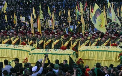 In this Tuesday, Oct. 27, 2015 file photo, relatives and comrades pray as they surround the Hezbollah flag-draped coffins of Shiite fighters who were killed in Syria, during a rally to mark the 13th day of the Shiite mourning period of Muharram, in Nabatiyeh, Lebanon. (AP Photo/Mohammed Zaatari, File)