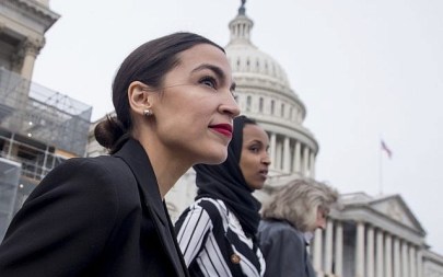 Democratic Represetnative Alexandria Ocasio-Cortez of New York, left, and Democratic Representative Ilhan Omar of Minnesota, center, walk down the House steps to take a group photograph of the House Democratic women members of the 116th Congress on the East Front Capitol Plaza on Capitol Hill in Washington, January 4, 2019, as the 116th Congress began. (AP Photo/Andrew Harnik)