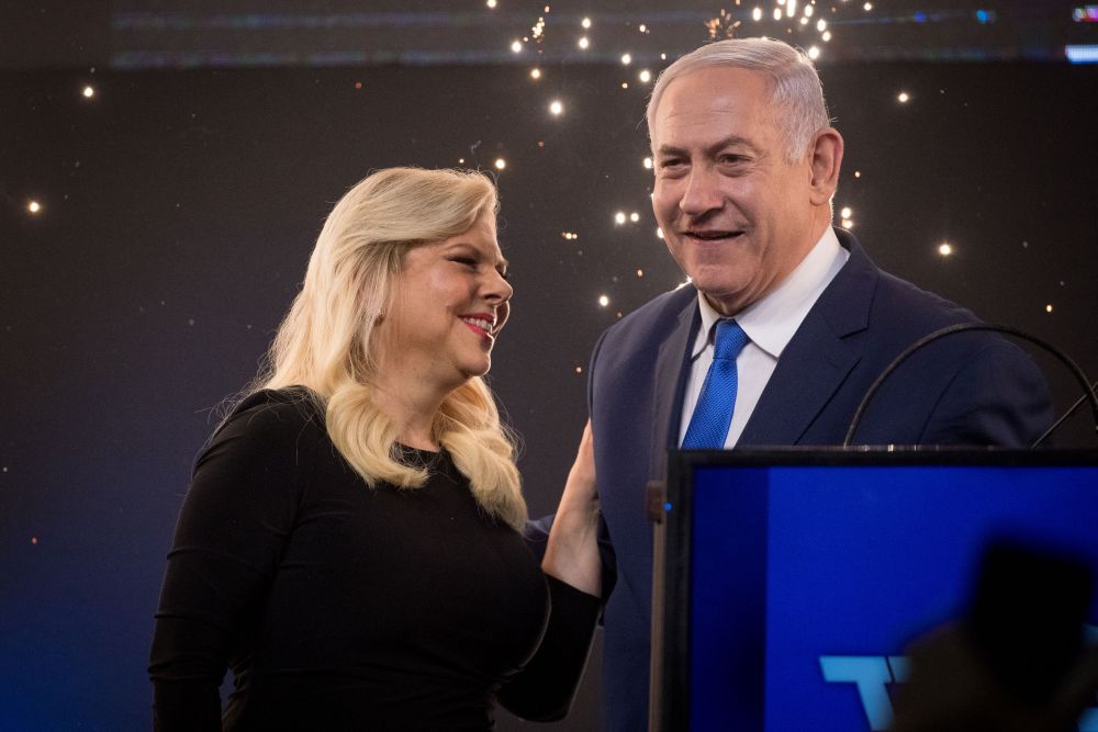 Israeli prime minister Binyamin Netanyahu and deputy foreign minister Tzipi Hotovely at his Likud Party headquarters in Tel Aviv on election night in the early hours of Wednesday. Photograph: Thomas Coex/AFP/Getty Images