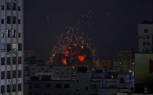 An explosion is seen among buildings during an Israeli airstike on Gaza City in response to rocket fire from the Palestinian enclave on May 4, 2019. (Mahmud Hams / AFP)